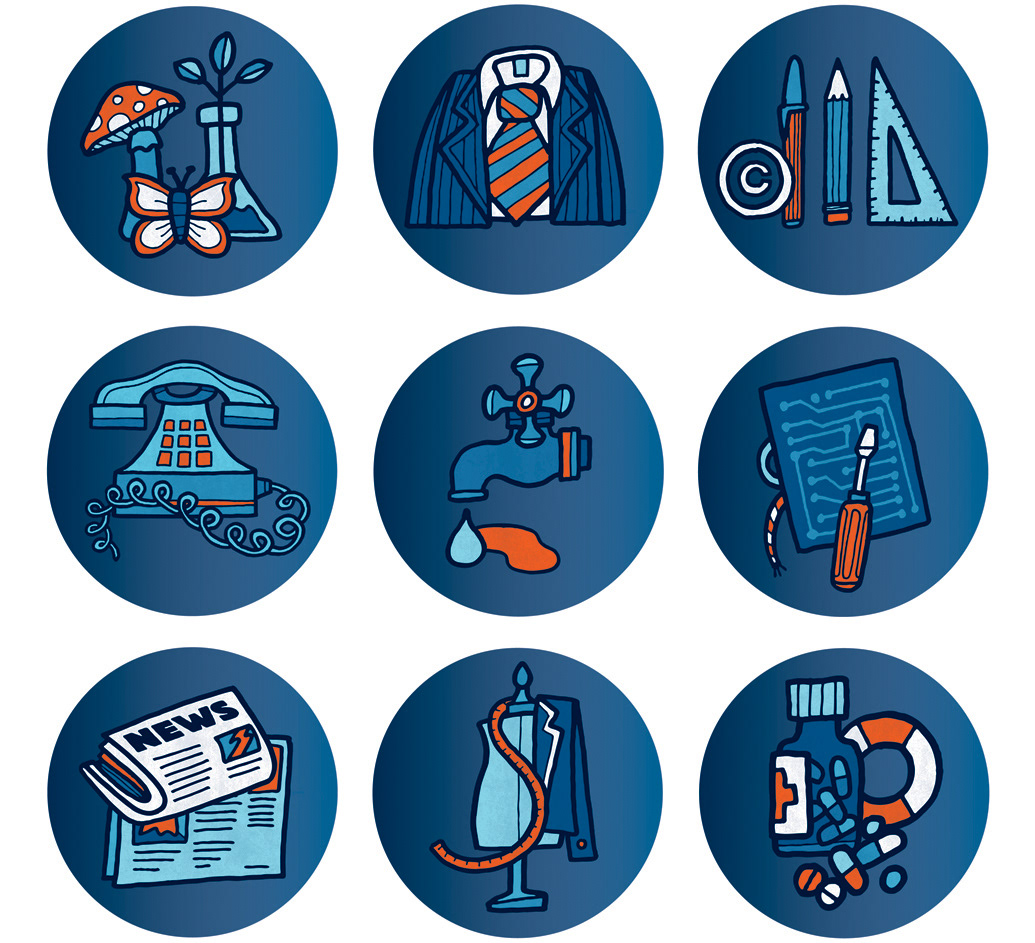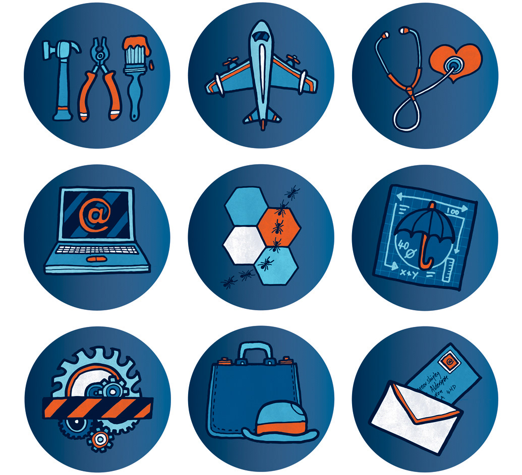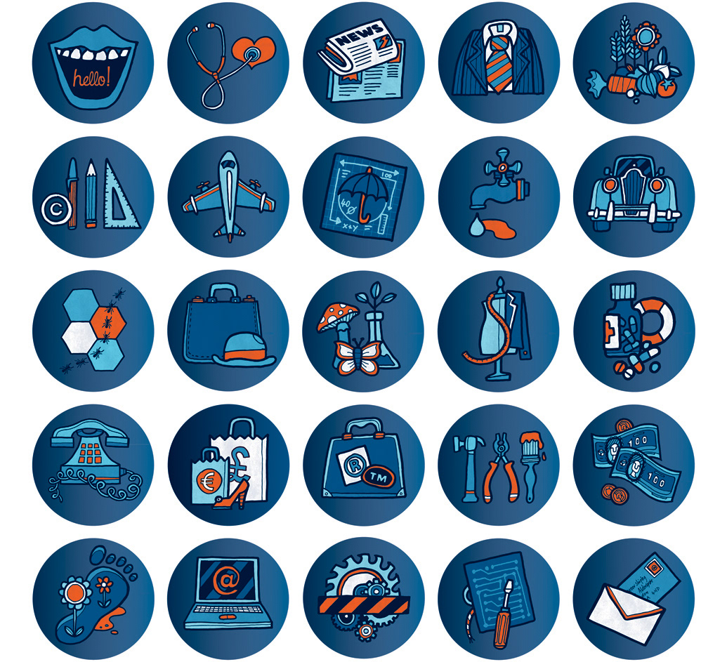 A collection of illustrations for Venner Shipley as part of the attorney firm's rebranding. The illustrations had to look fresh & fun but still be in keeping with the company's ethos, all illustrations had to be in a strict colour scheme of the new identity, so only blues & orange.