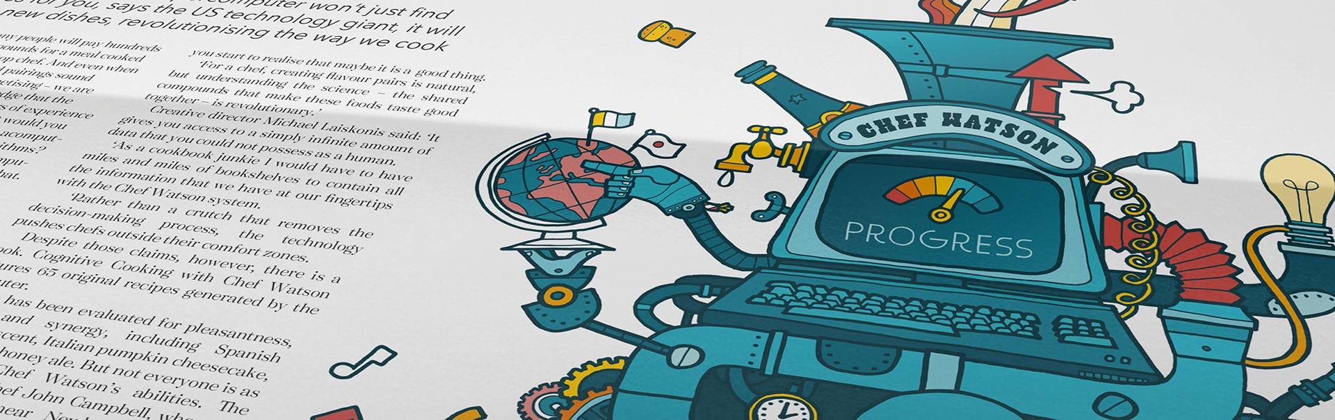 Waitrose commissioned me to illustrate this fun piece for their Waitrose Weekend publication. Meet Chef Watson, a super computer that combines ingredients for unusual but ‘supposedly’ pleasing food pairings. Input your ingredients, countries /cuisines & this supercomputer does the rest coming up with unusual recipes to tantalise the tastebuds.