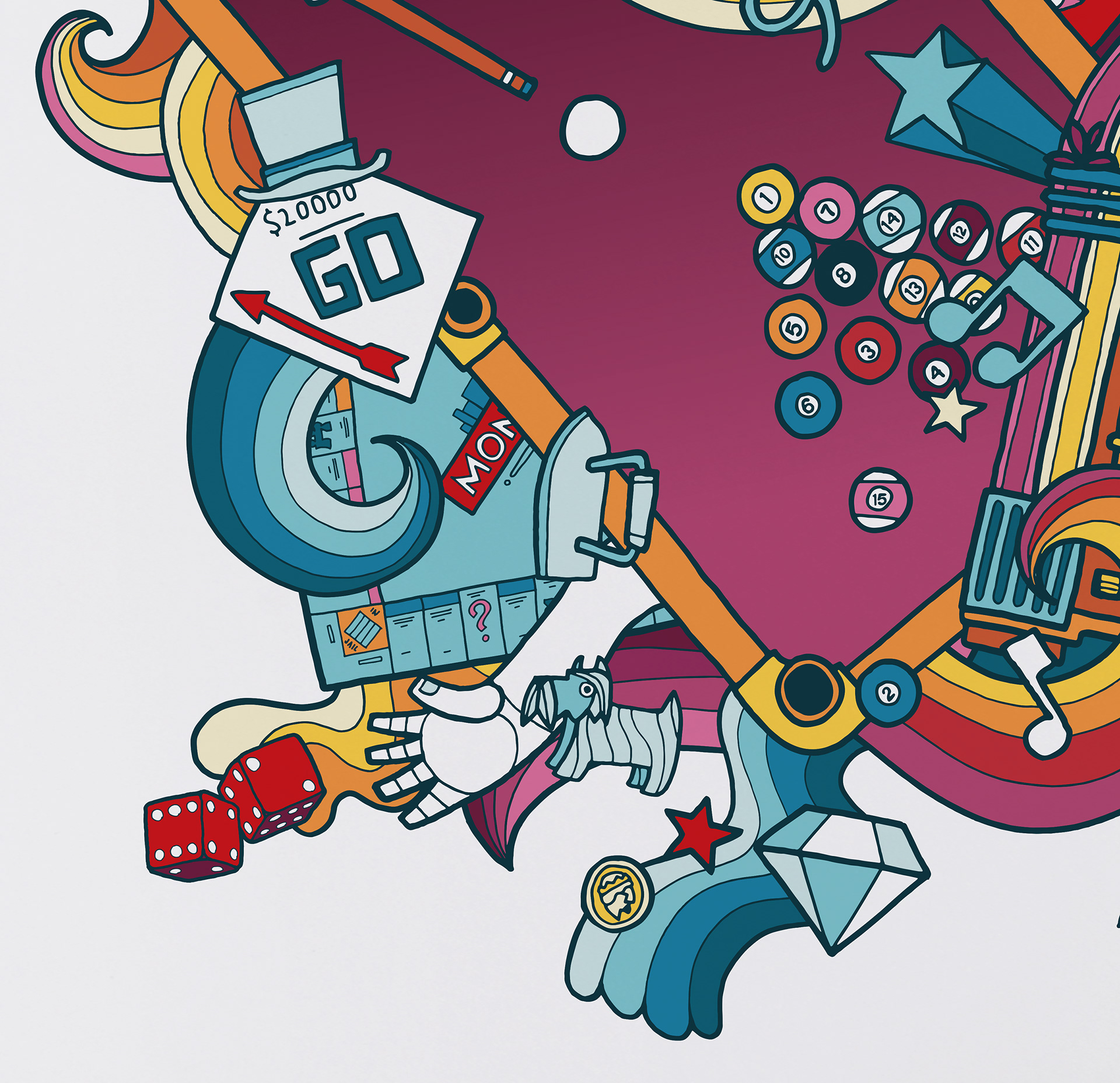 Wardour Communications commissioned me to create this double page spread for Publife magazine. The magazine is a trade publication from STAR pubs & bars, part of the Heineken group. The article was about how paid games, events & vending machines in the pubs & bars could increase the venues income. I had fun combining all the various games, from fruit machines, jukebox to pool & prize winning quiz vending machines based on popular boardgames and TV shows.