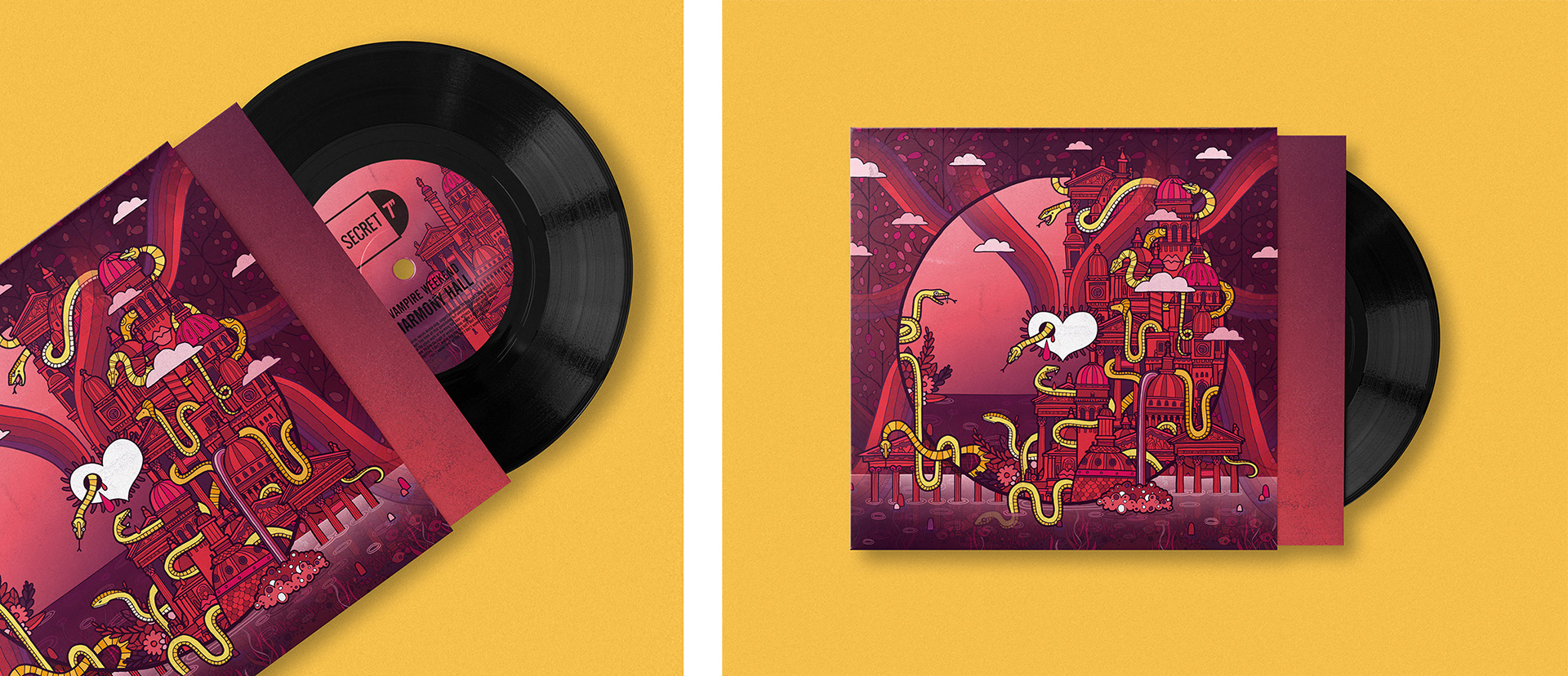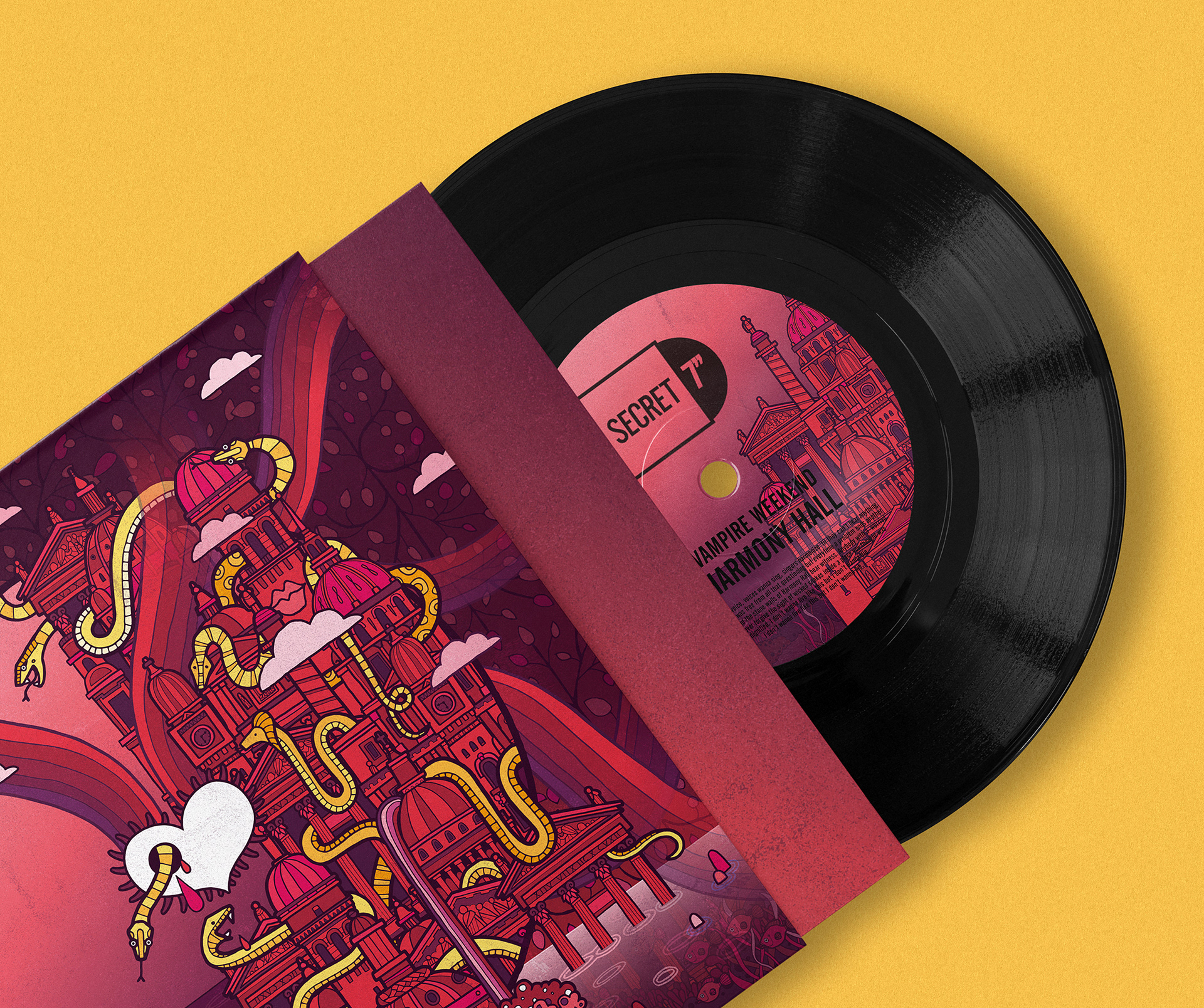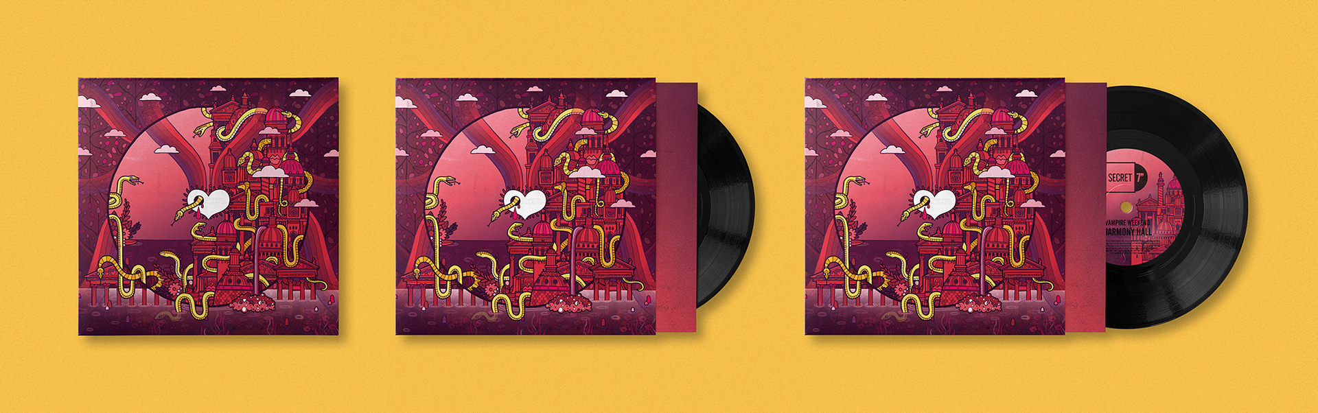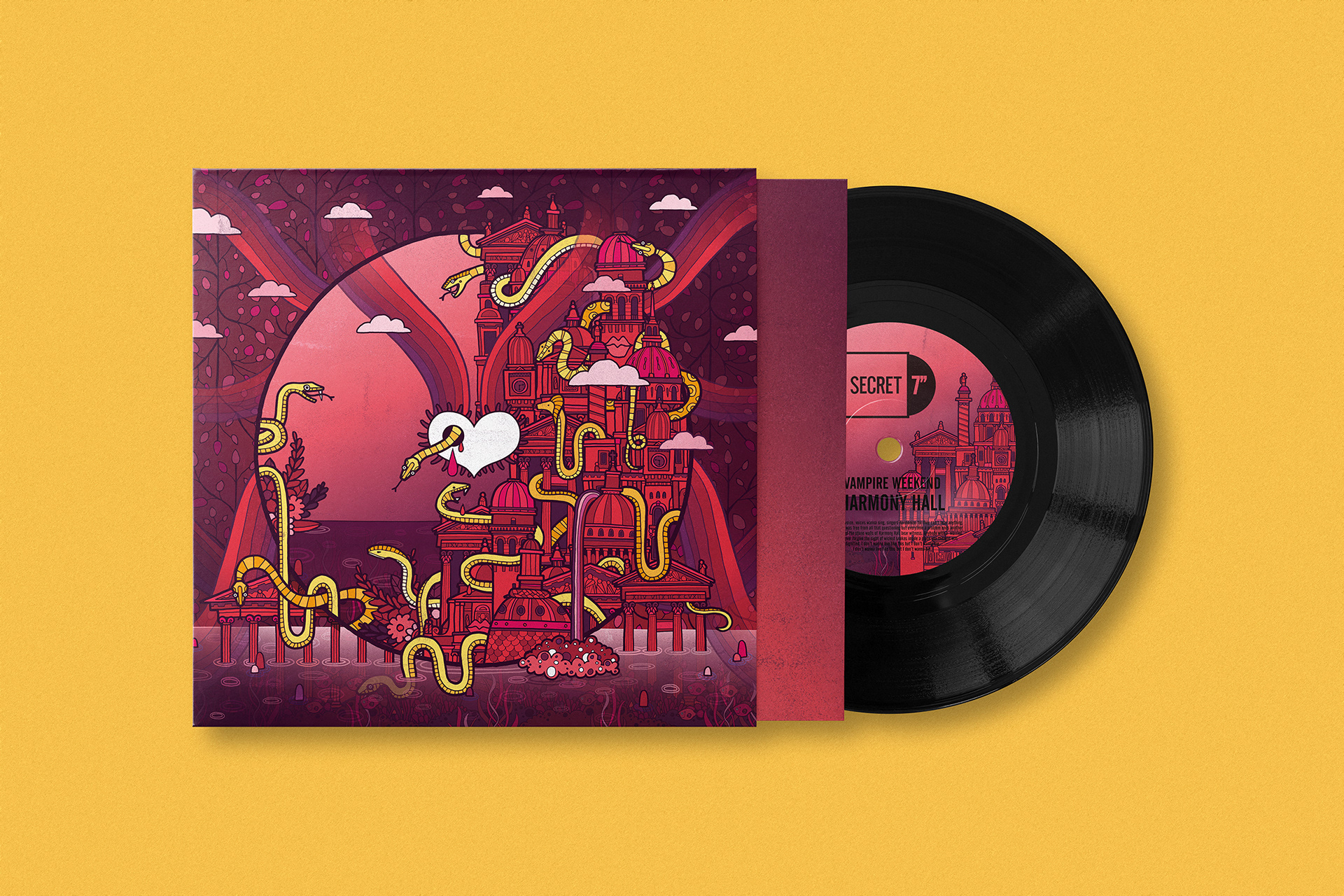 Record cover artwork for Vampire Weekend's song 'Harmony Hall'. As part of the charity initiative secret 7" the artwork helped raised money for Choose Love refugee charity. The song is a criticism of hypocrisy, bigotry & deceit & represents intolerance in all its ugly forms.