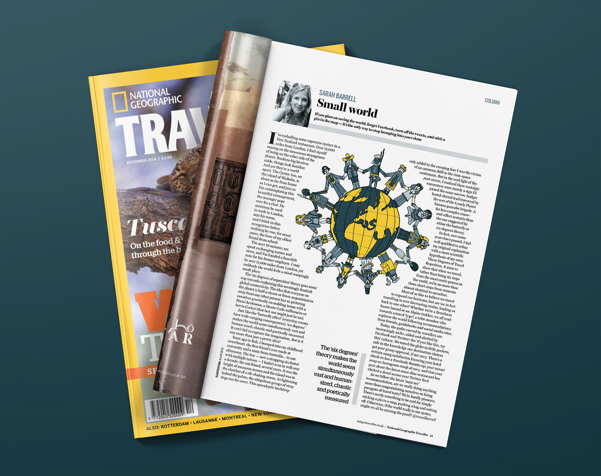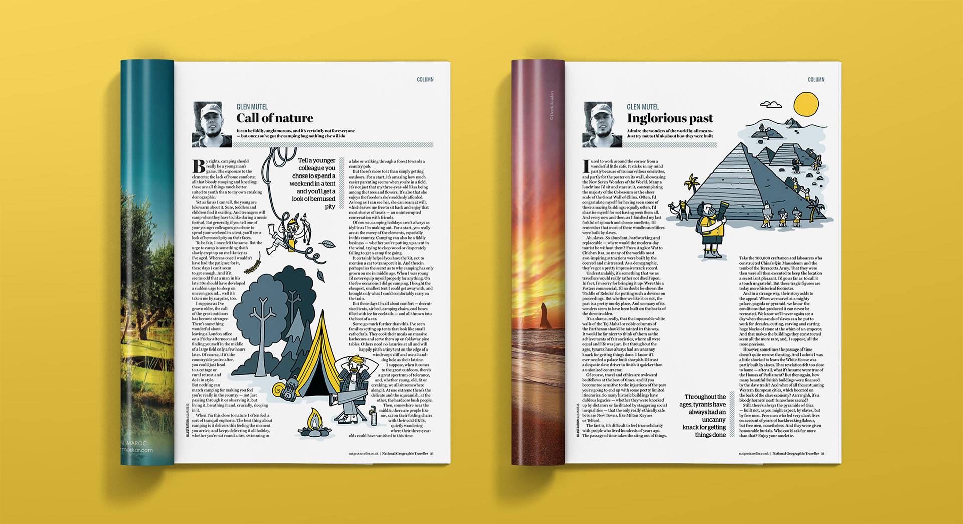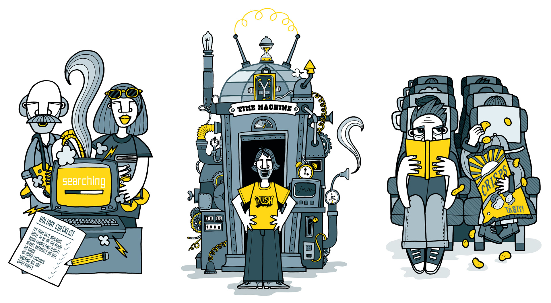 Editorial illustrations for National Geographic's Traveller & Family magazines. Various themes for the columns' topics ranging from loosing your kids in the airport to hating the overly helpfulness of staff in luxury hotels, thinking you've discovered a new place when you havn't & cocktails of the world. Illustrations to accompany a range of articles by different writers but always using the refined colour palette of blues, greys & yellow.