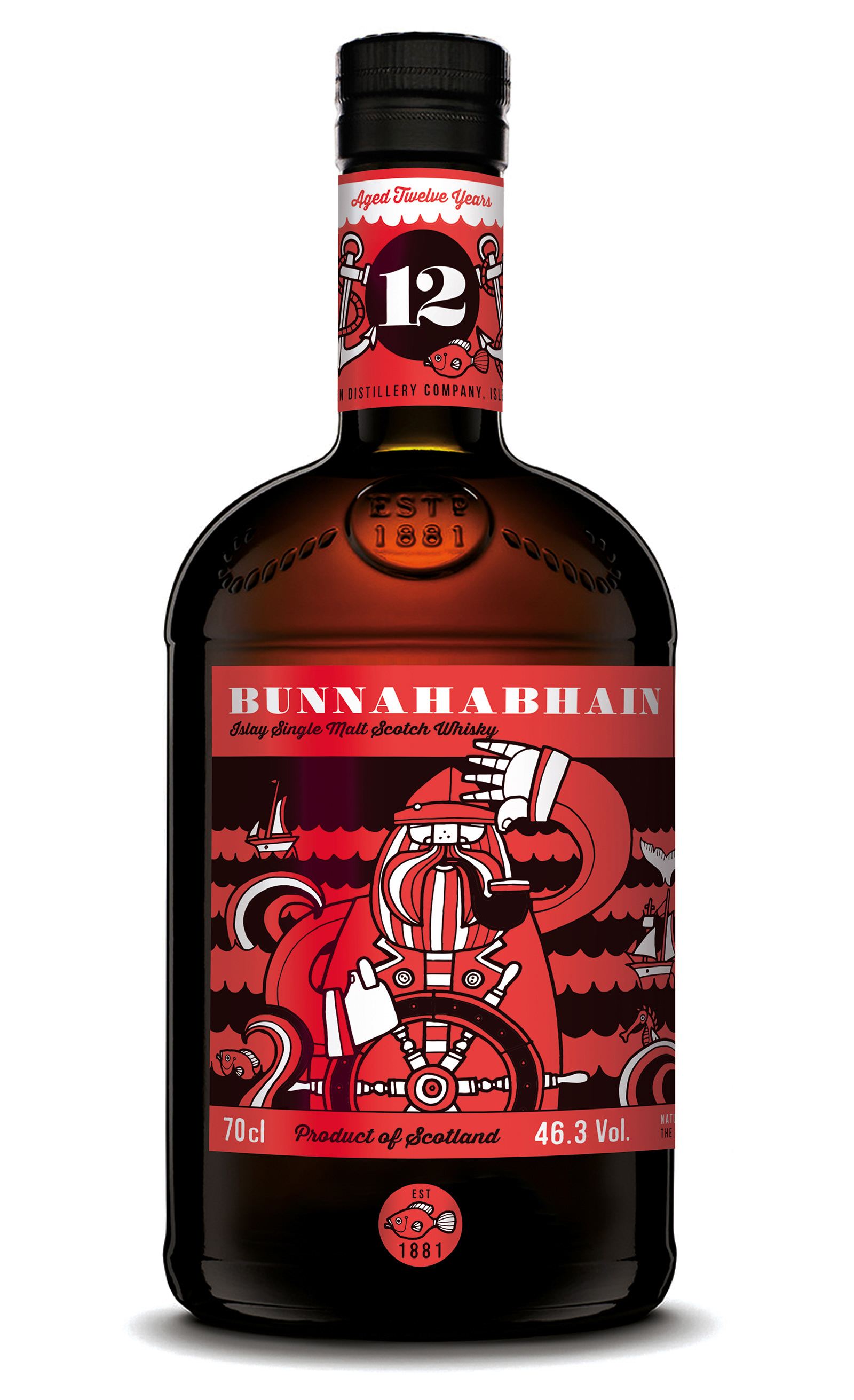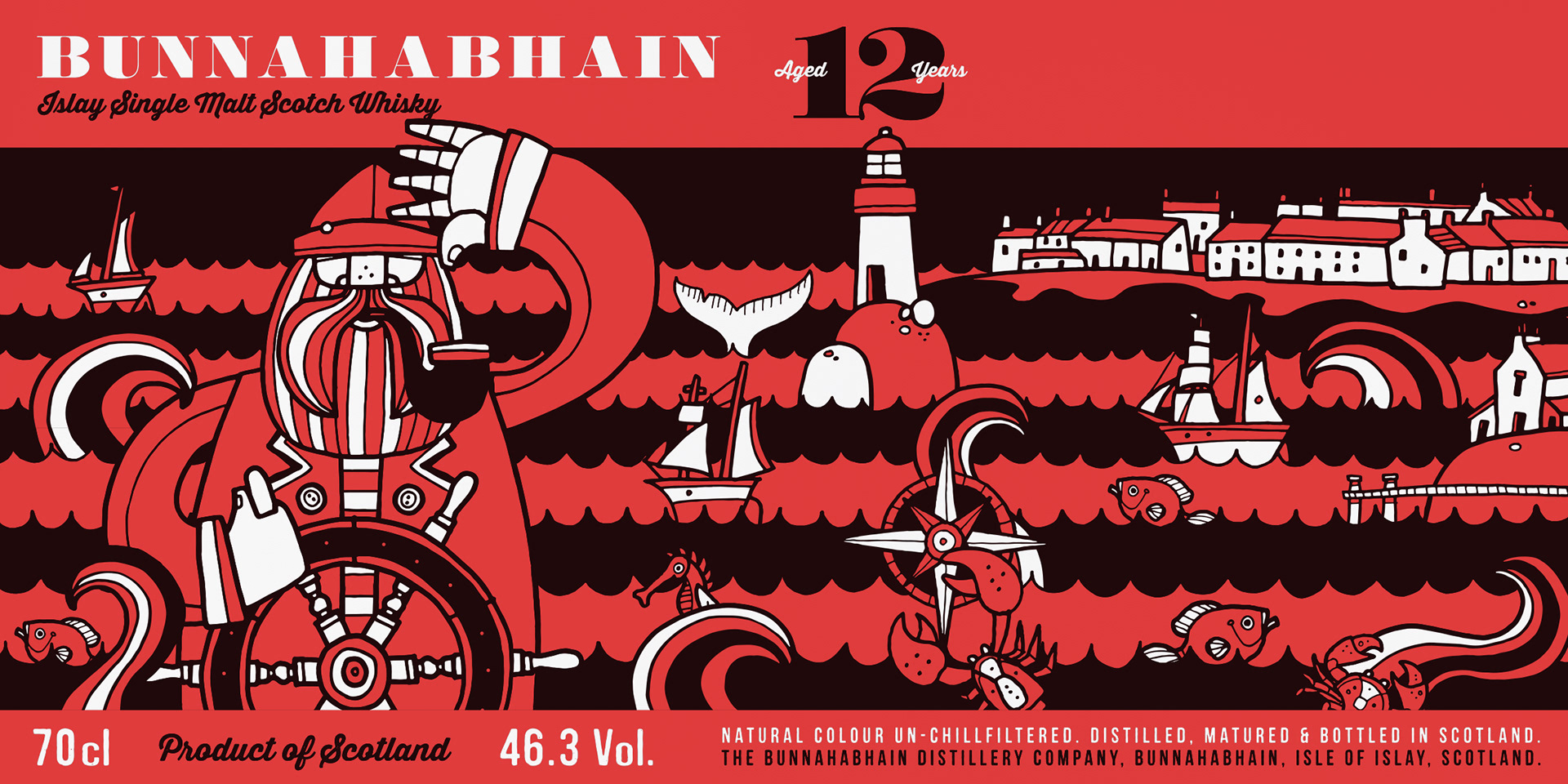 Limited edition label concept for Bunnahabhain single malt whisky. Stripe communications & The Bunnahabhain distillery partnered with The Fishermen’s Mission charity challenged designers to come up with a new label for their 12 year bottle reimagining their trademark helmsman.