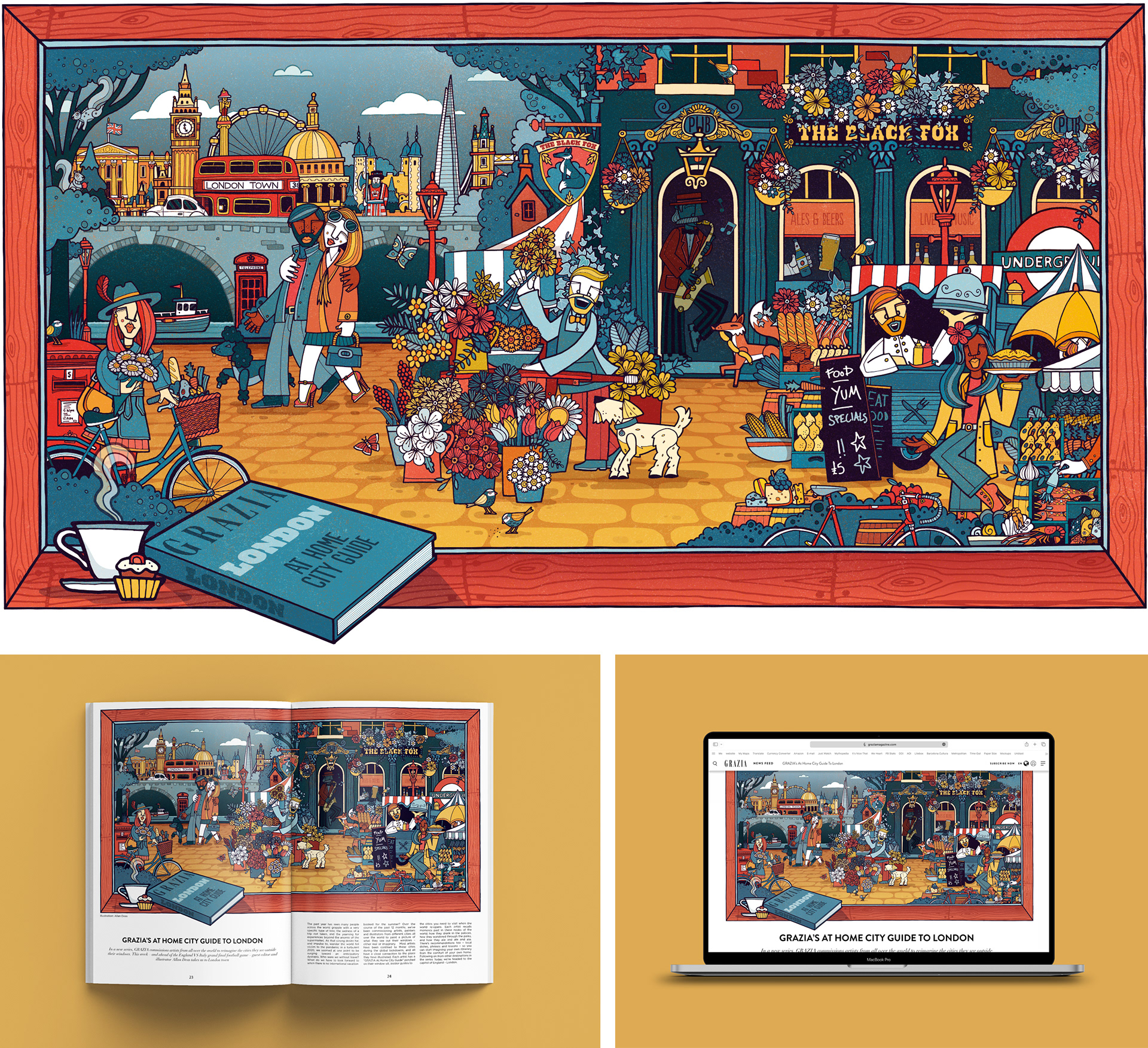 As part of their ’At Home City Guides’ various creatives were asked to illustrate a city close to their hearts and talk a little about it. The idea was a way for readers to travel vicariously in times where people are less able to mobilise due to restrictions or lockdowns. My designated city was London.