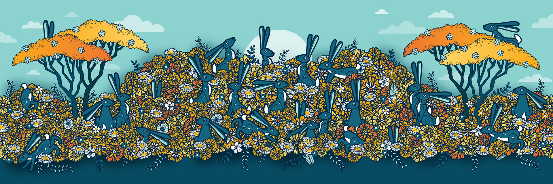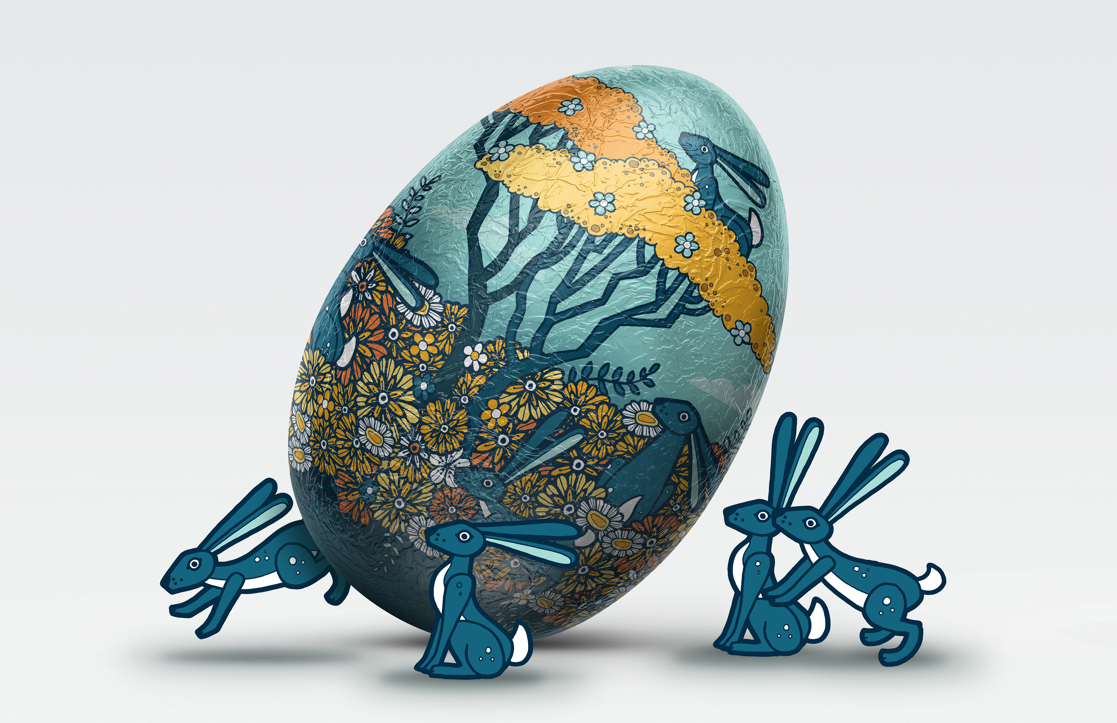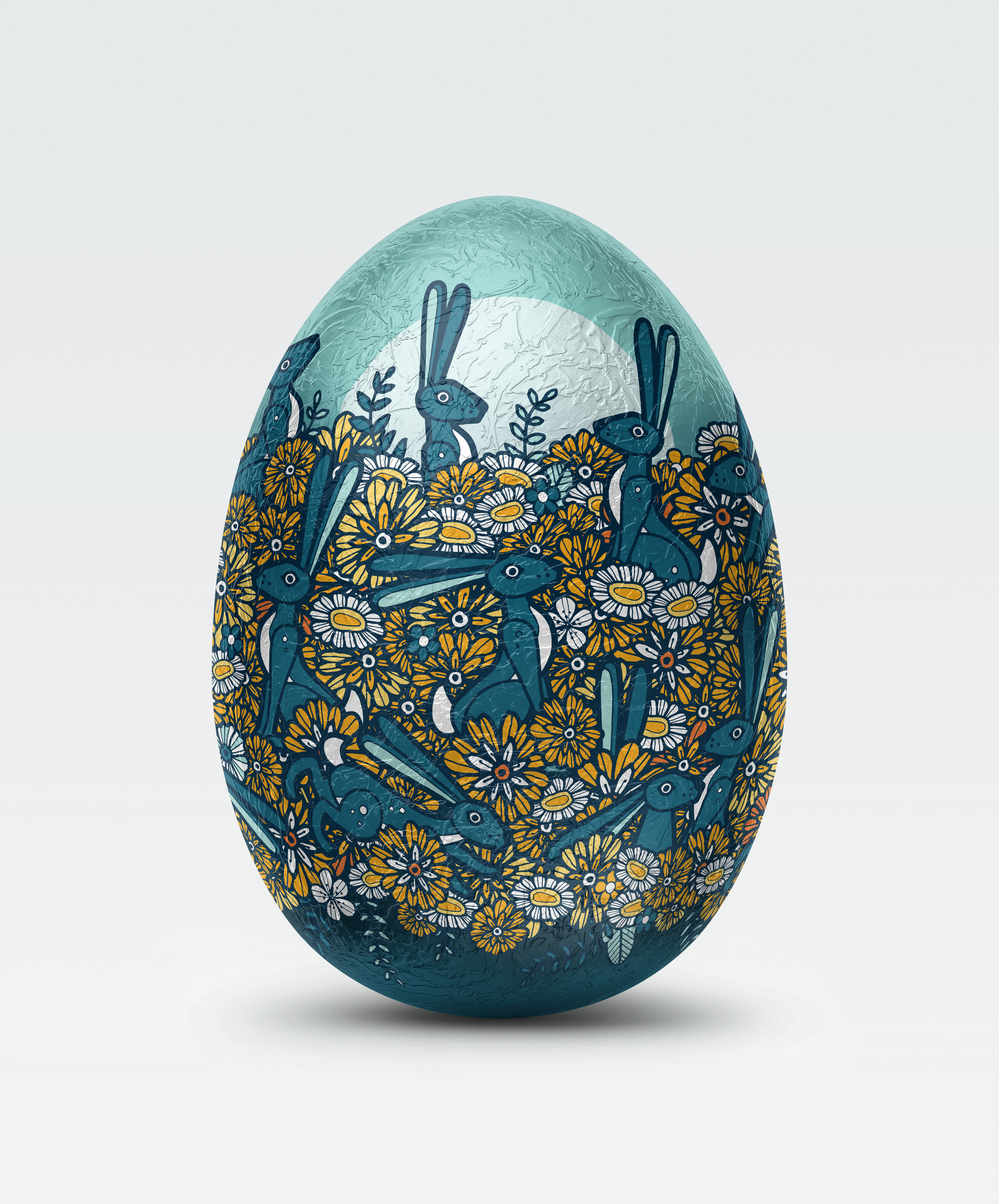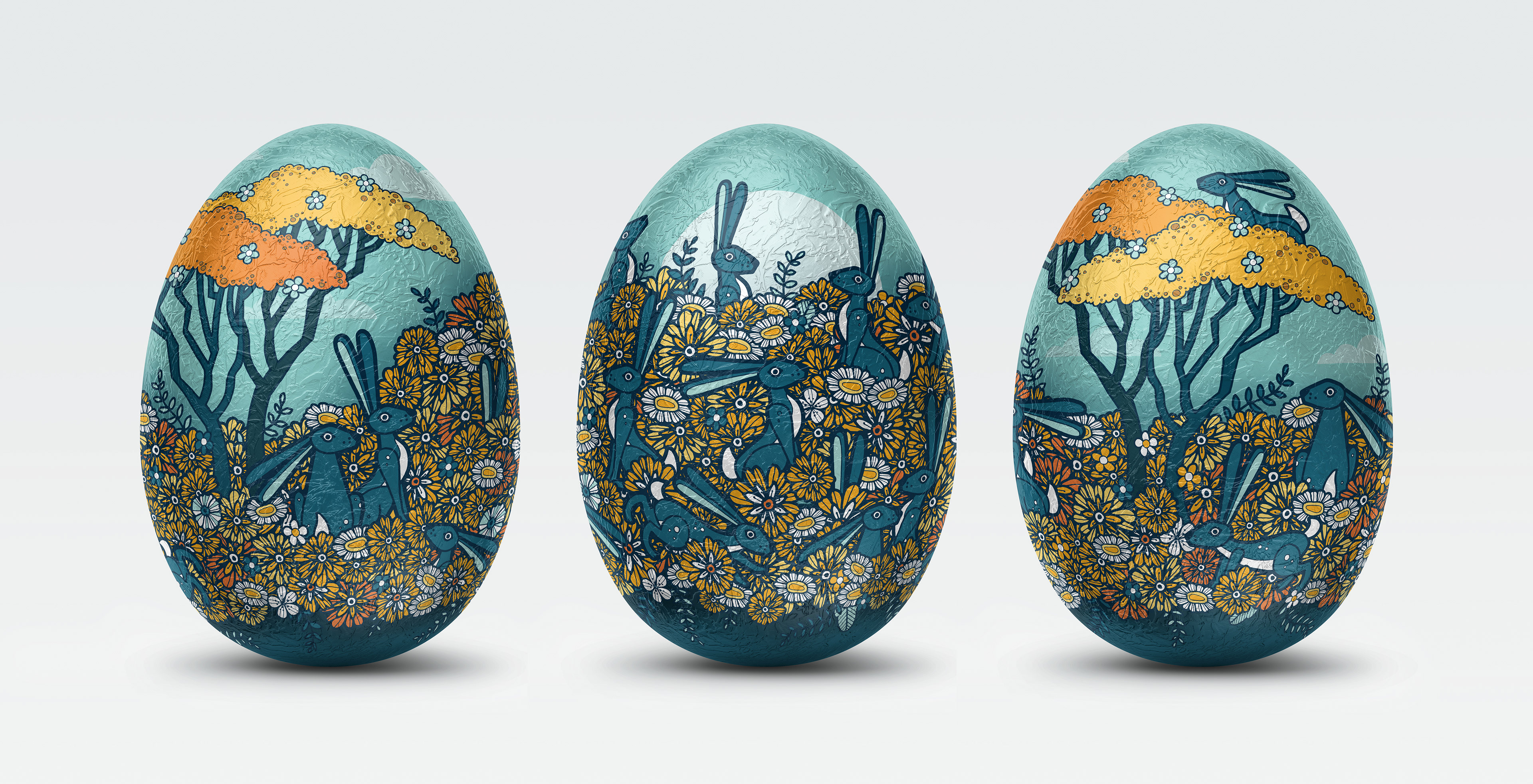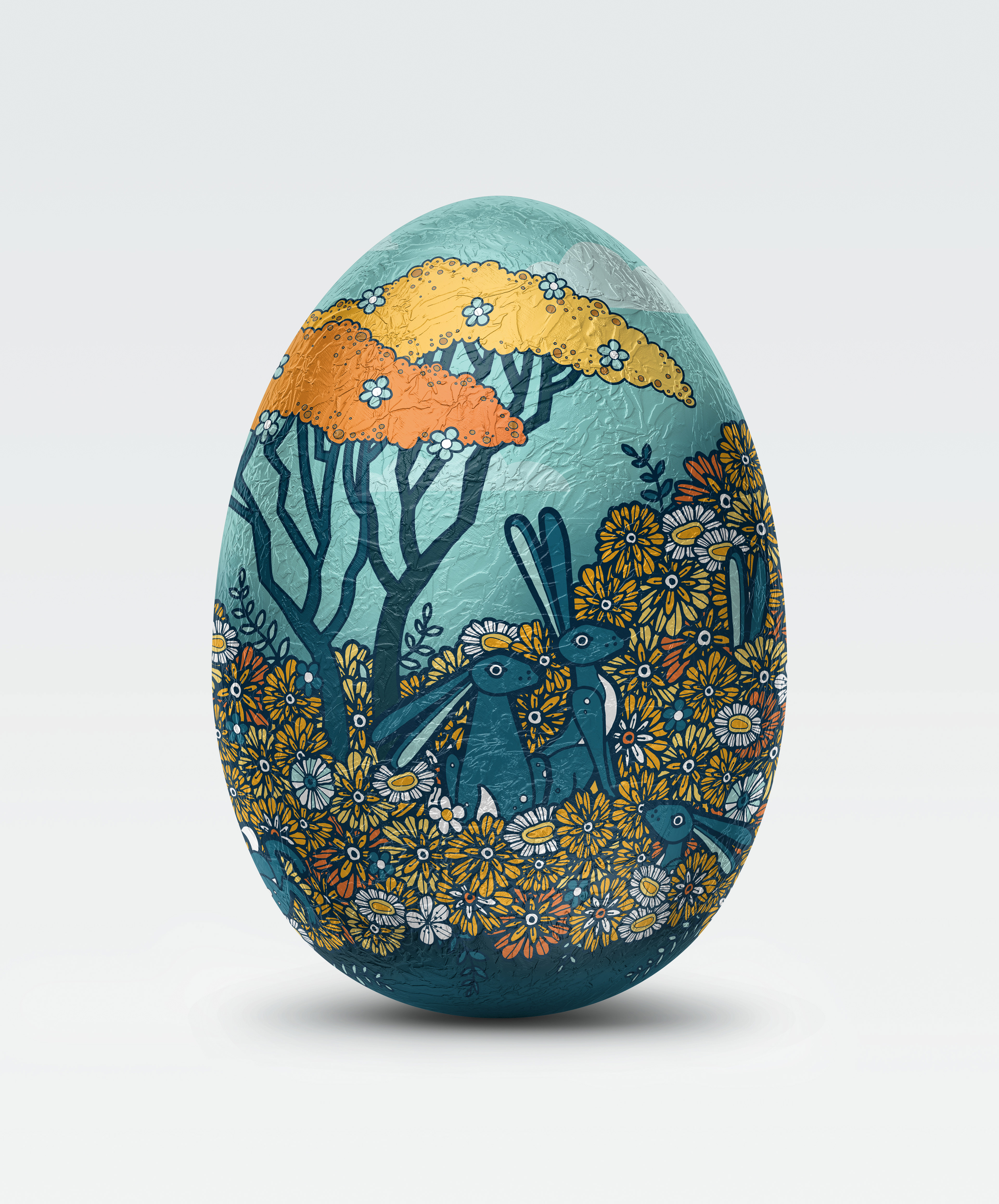 Some foil chocolate easter egg wrappers I worked on featuring a springtime meadow filled with flowers in bloom & playful Easter bunnies hopping about searching for tasty treats! I've always loved the shiny foil on chocolates so this project was a real treat for me!