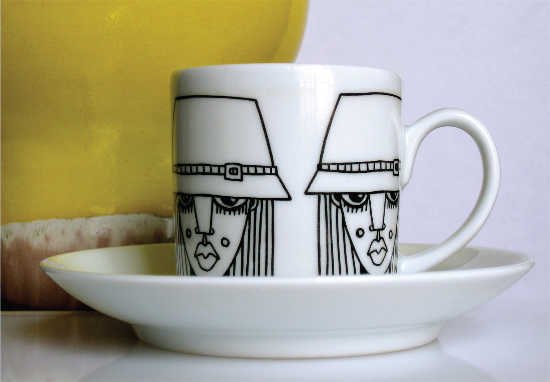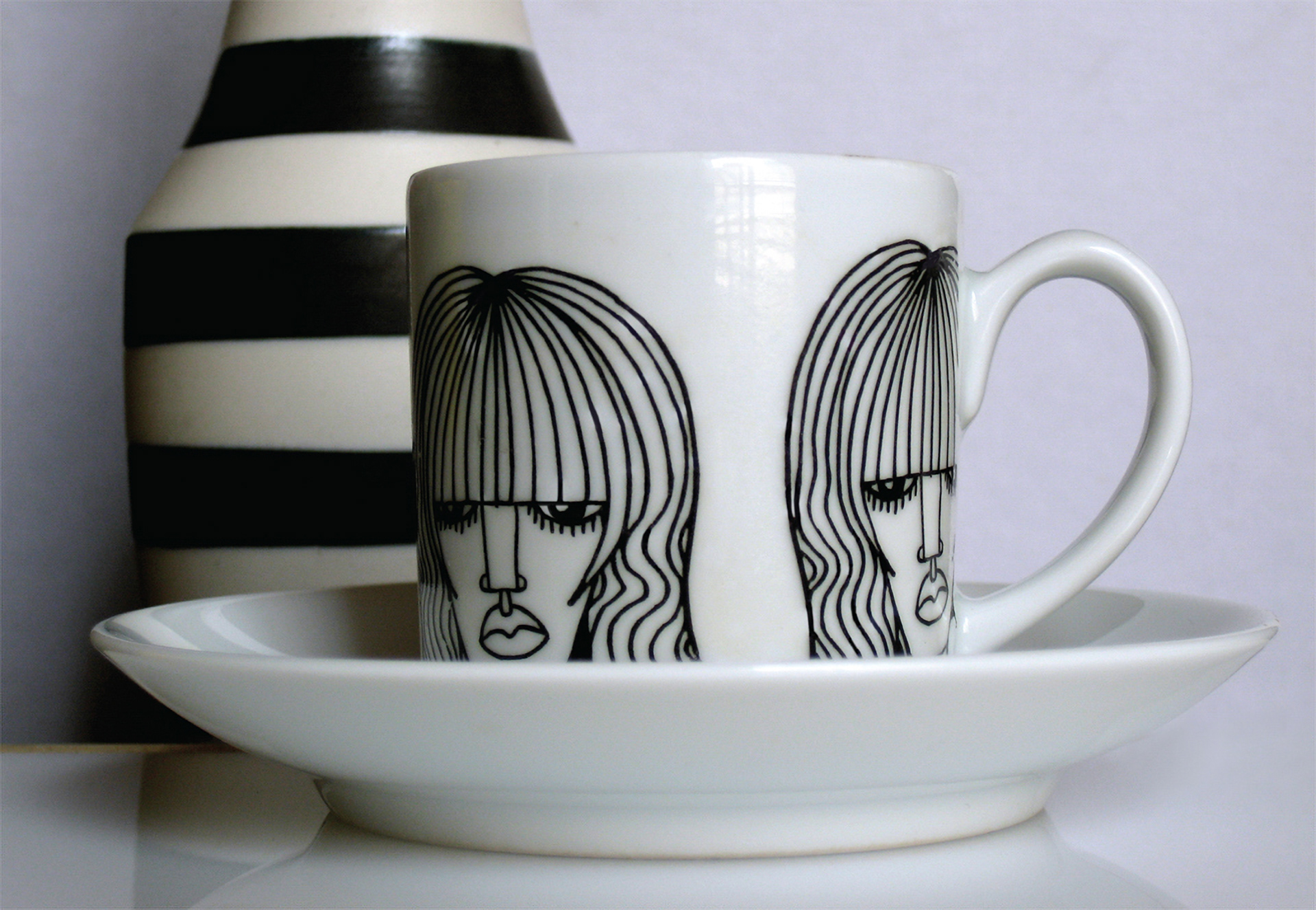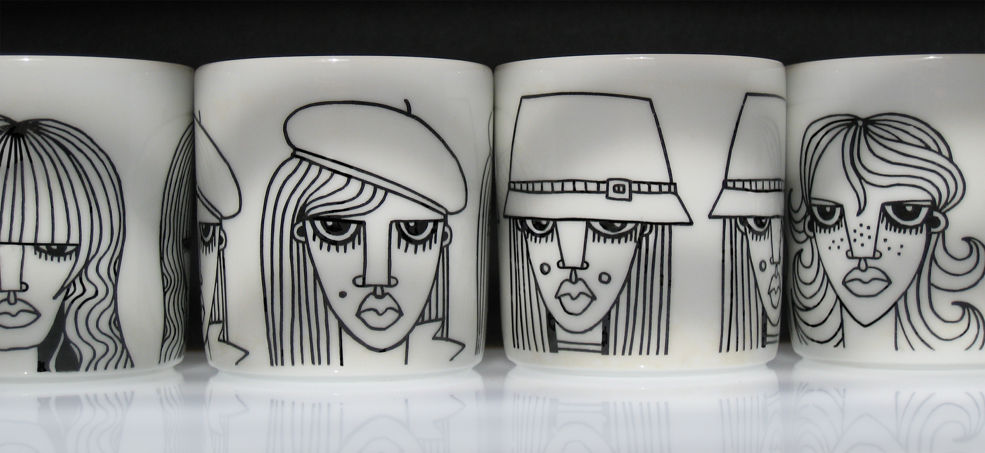 Something about black line work lends itself really well to being applied to fine porcelain. The subject matter of the girls & women focusing on lines & pattern in their hair looks really good printed on the white cups. Makes me want a coffee right now!