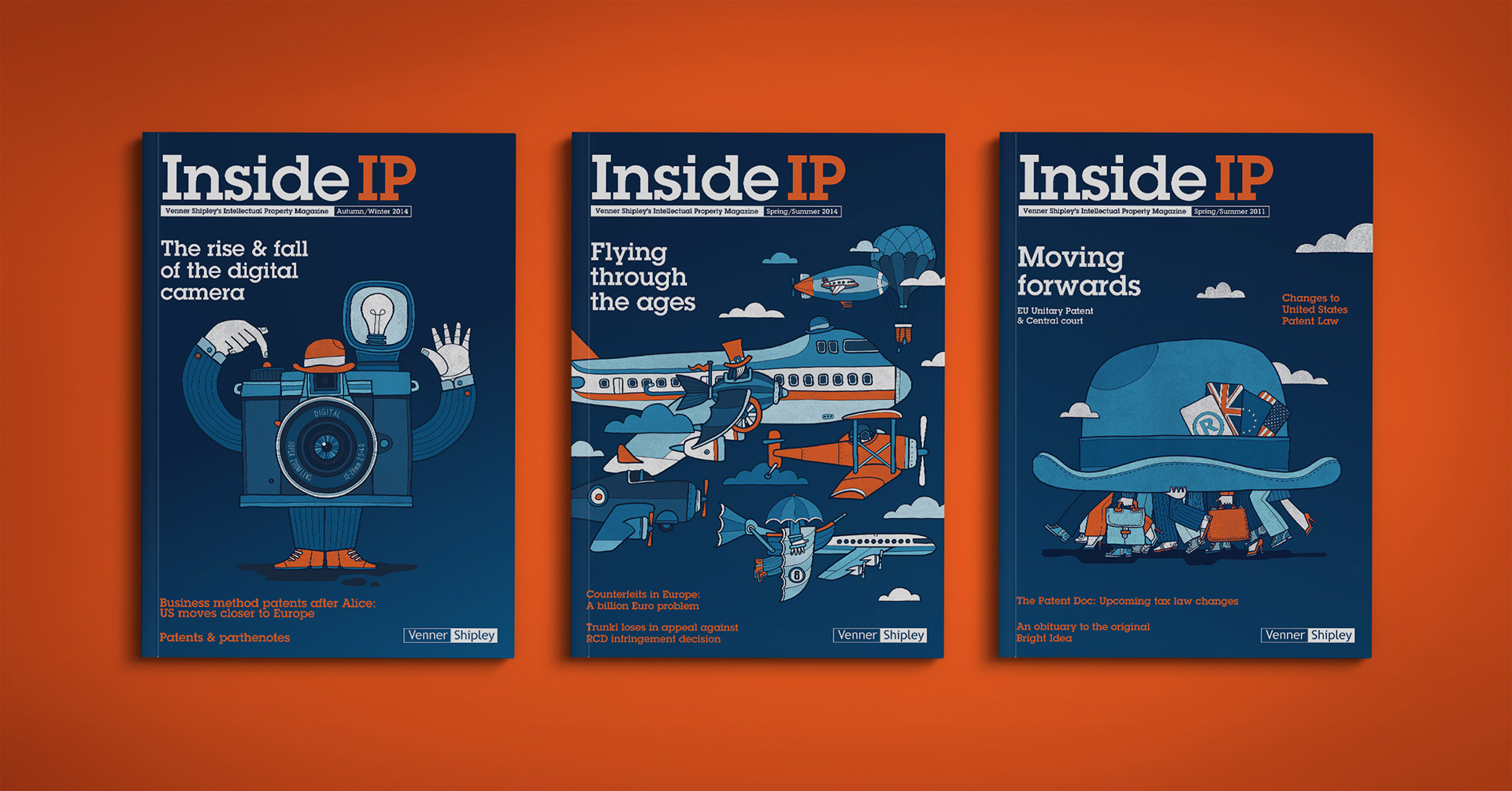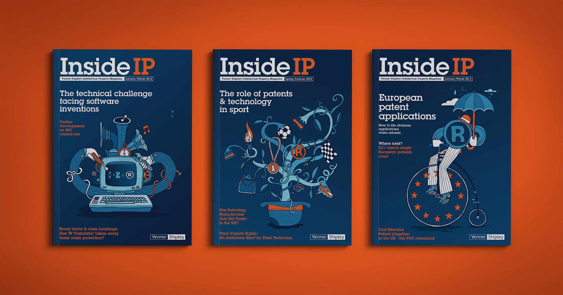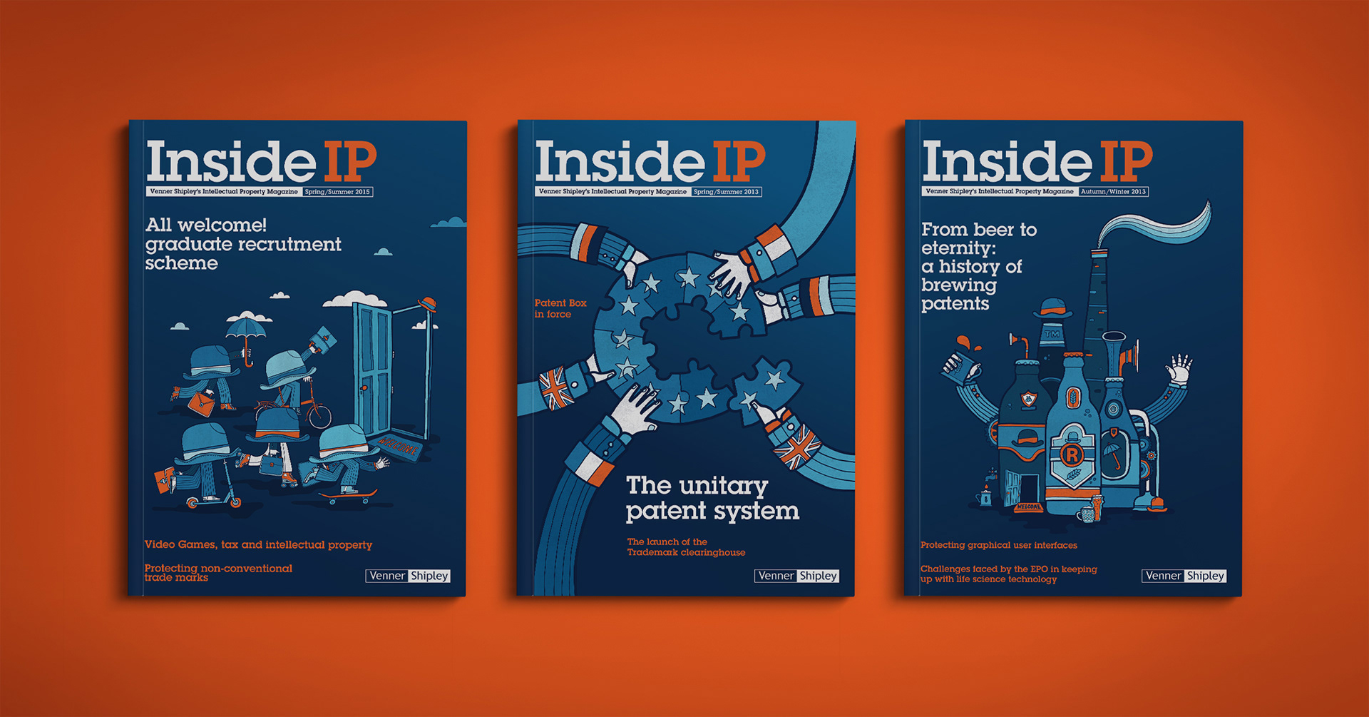 Illustrated covers for Inside IP magazine the intellectual property speciality publication from Venner Shipley. I had the opportunity to work on cover artwork for several issues, in the company's trade mark blue and orange colourscheme which makes for a nice little collection.