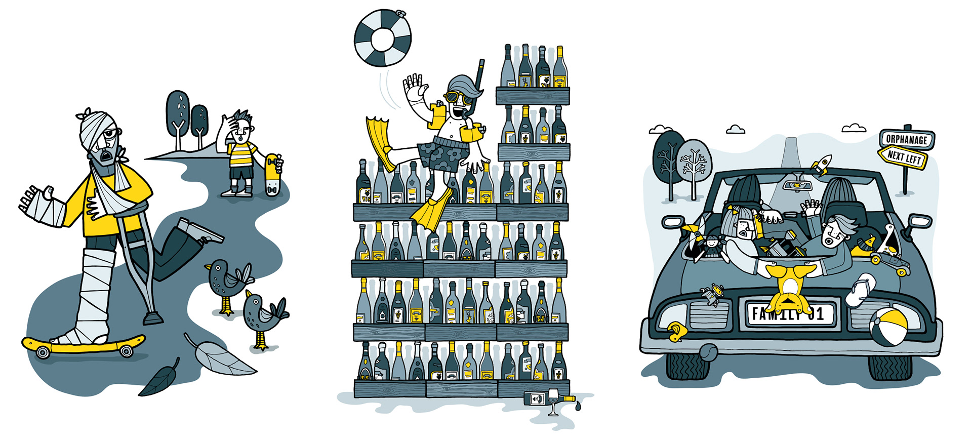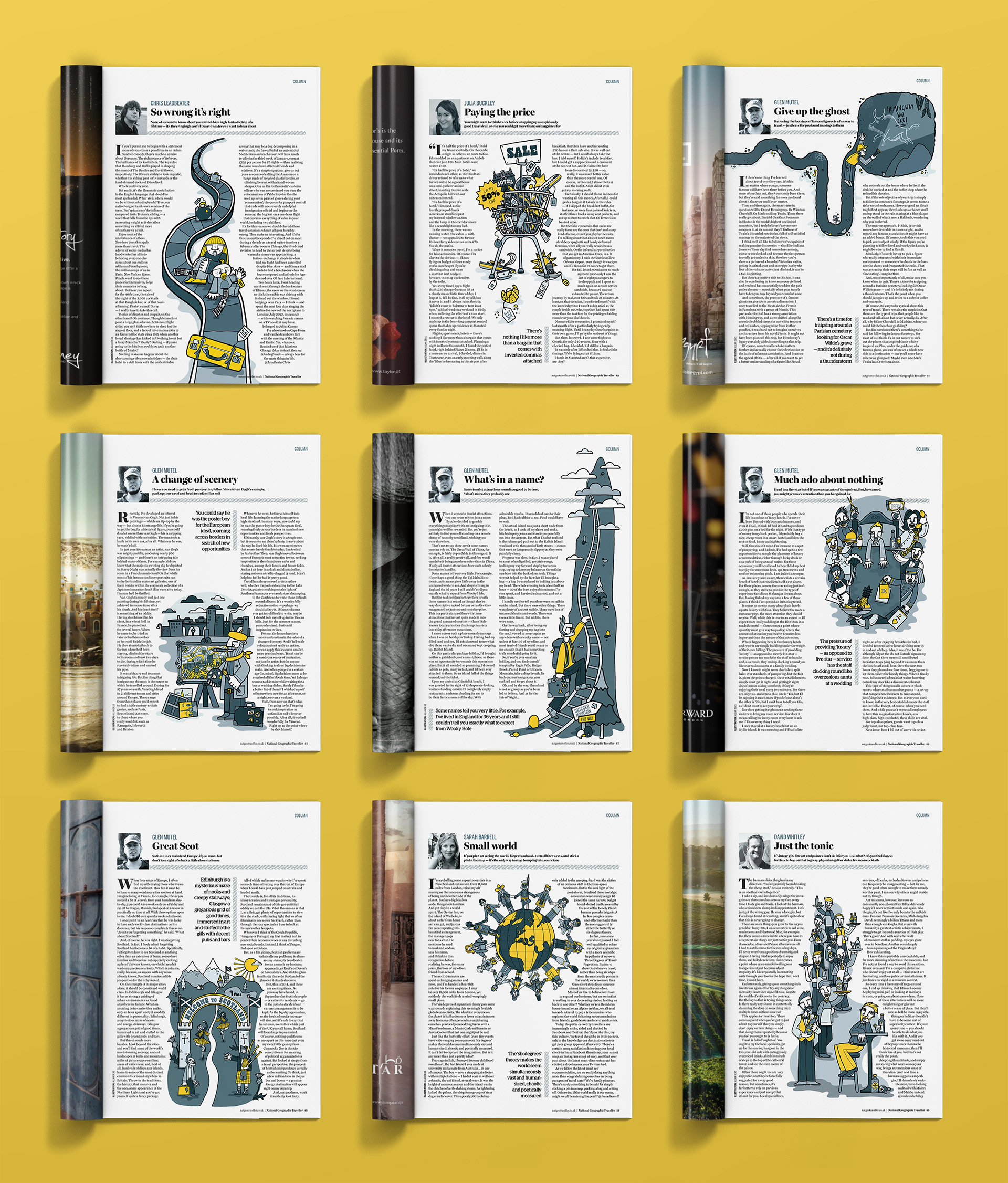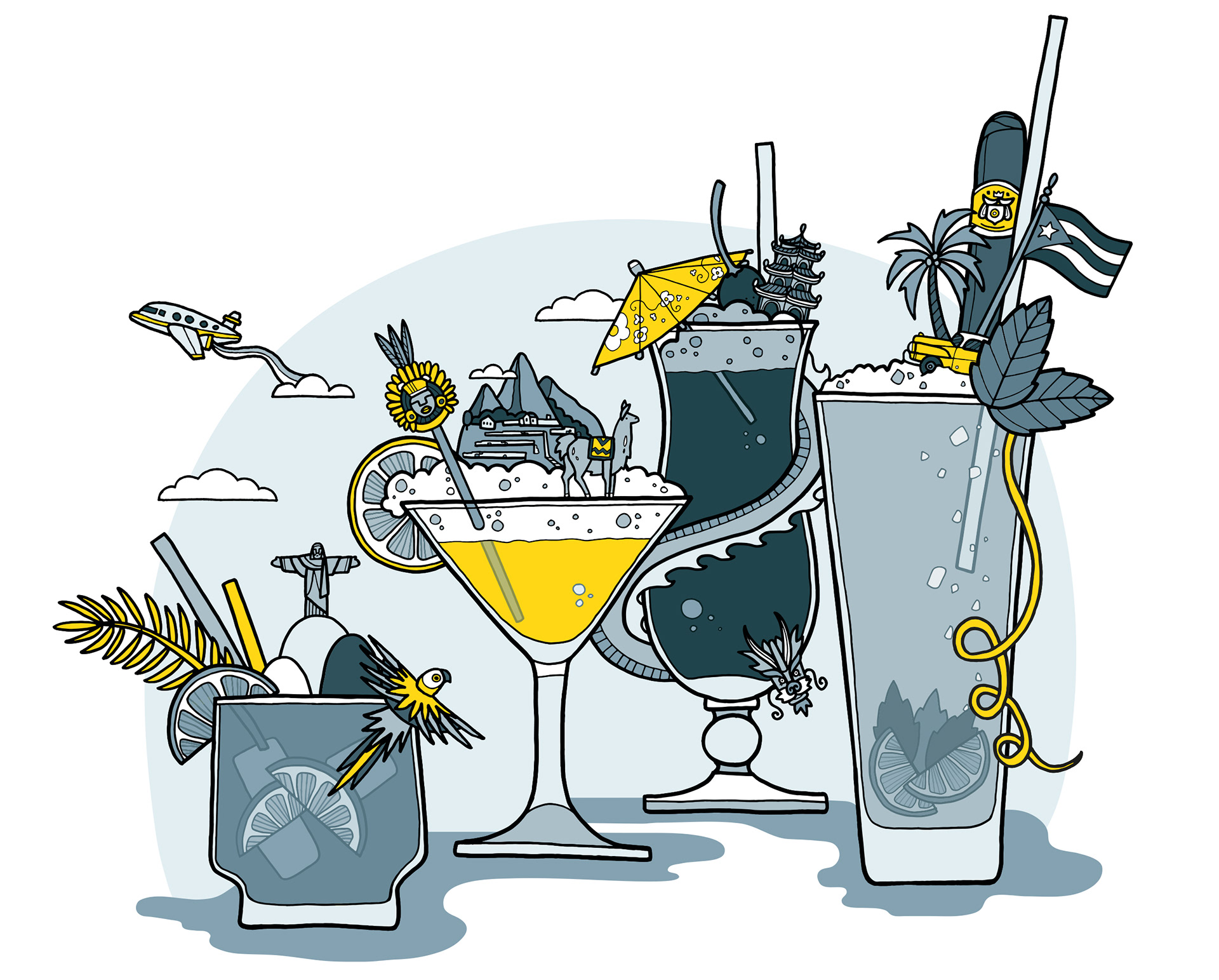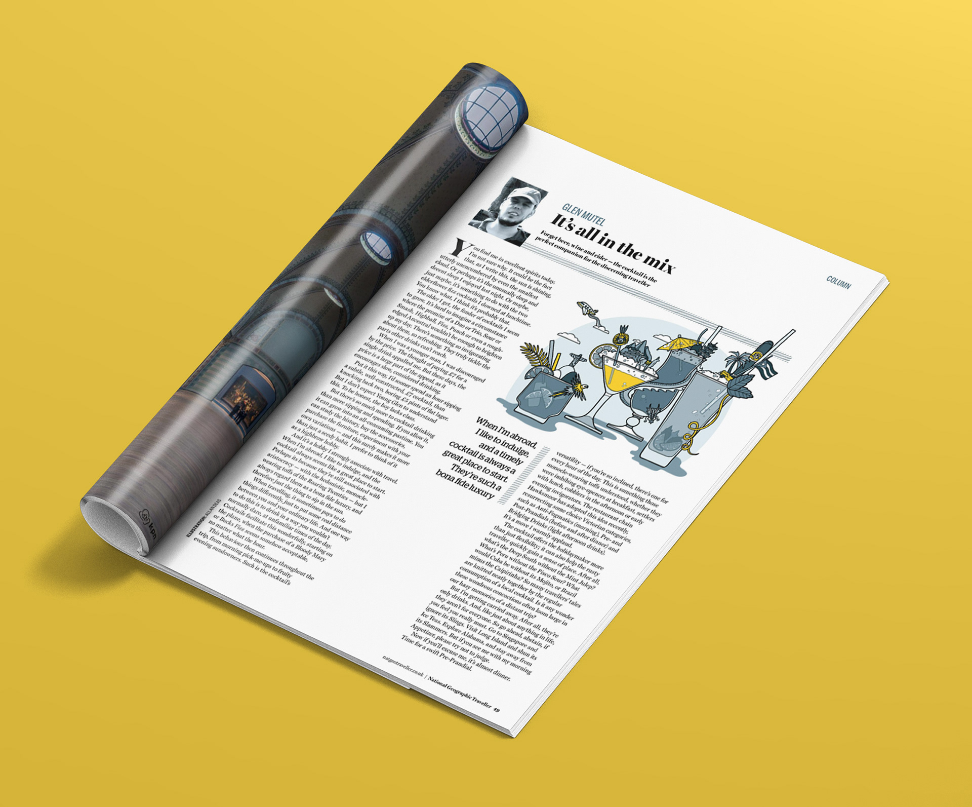 Editorial illustrations for National Geographic's Traveller & Family magazines. Various themes for the columns' topics ranging from loosing your kids in the airport to hating the overly helpfulness of staff in luxury hotels, thinking you've discovered a new place when you havn't & cocktails of the world. Illustrations to accompany a range of articles by different writers but always using the refined colour palette of blues, greys & yellow.