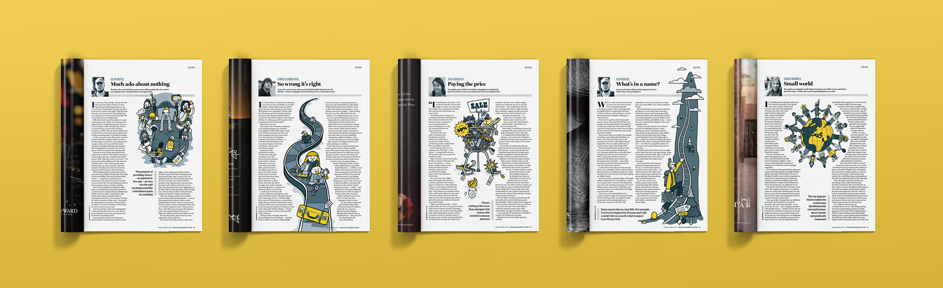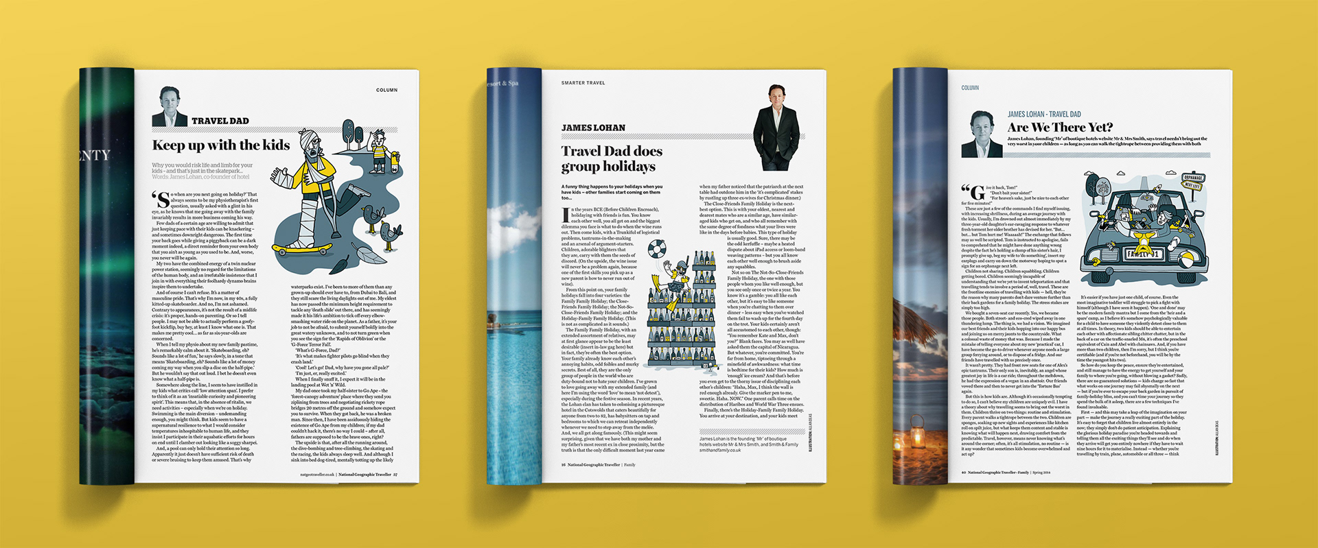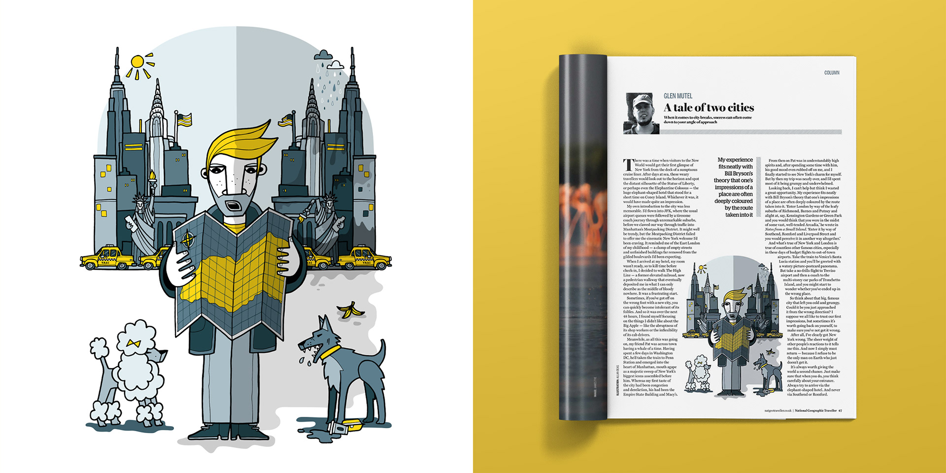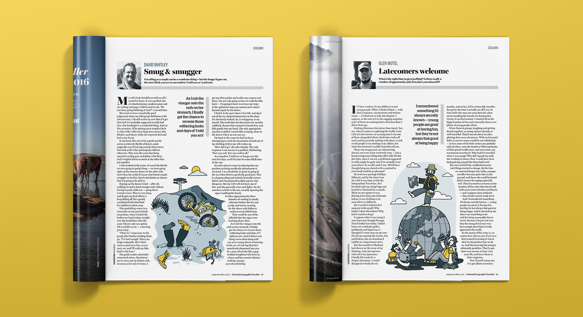 Selected illustrations for a monthly column in National Geographic Traveller magazine. Illustrations covered a range of topics from six degrees of separation & loosing your kids at the airport to homogonised hipsterfication of destinations. All designs in the Nat Geo signature colours.