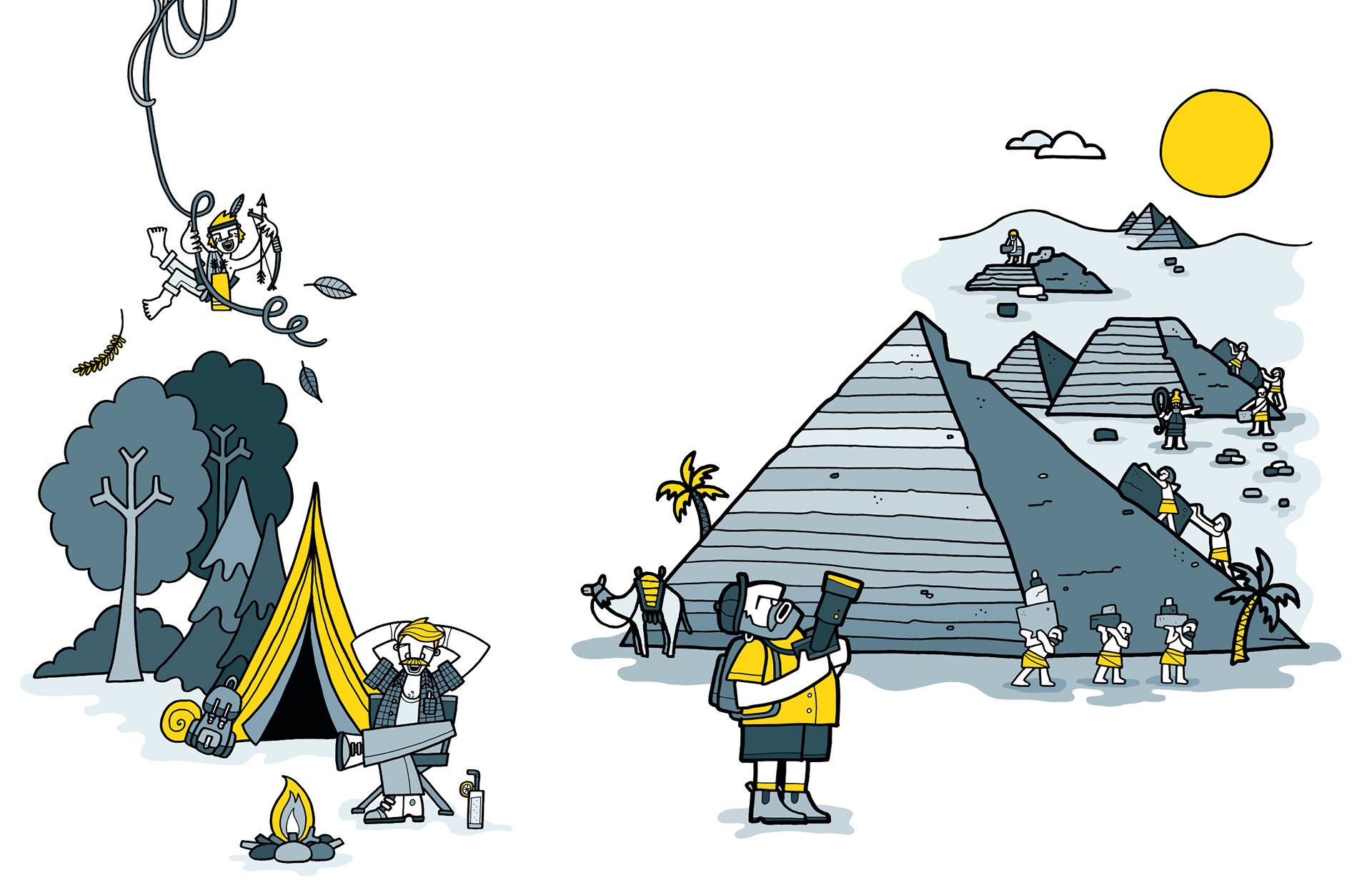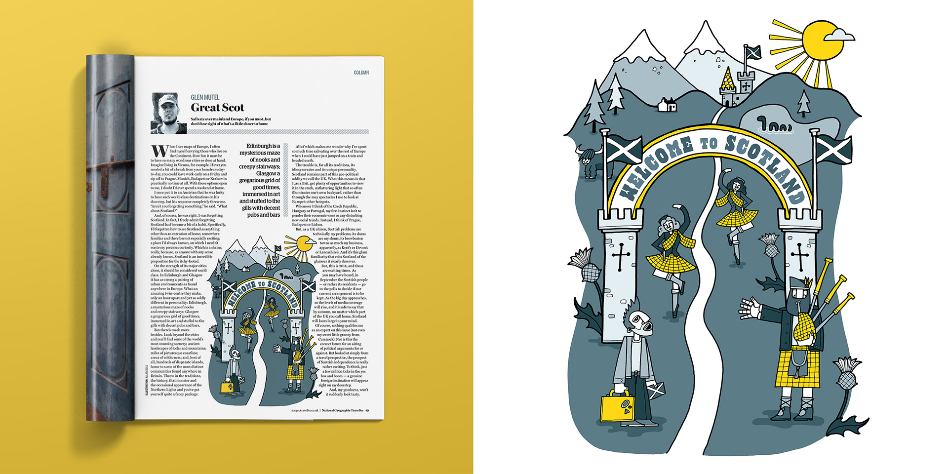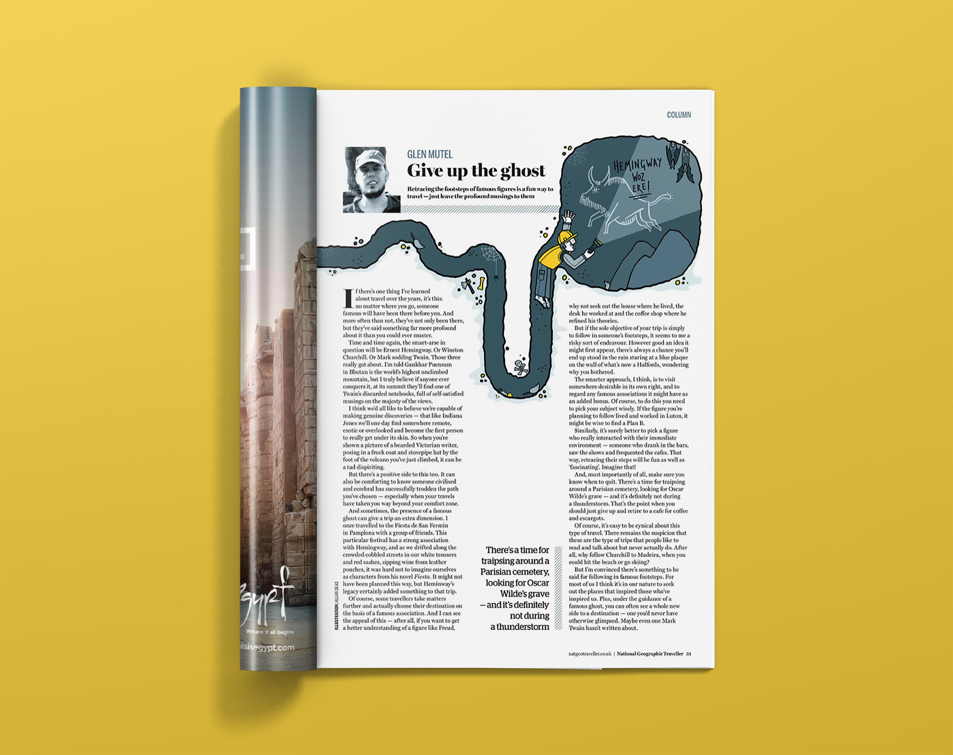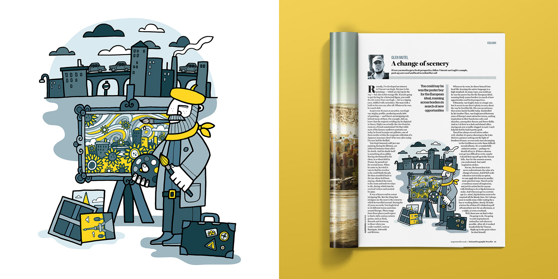 Selected illustrations for a monthly column in National Geographic Traveller magazine. Illustrations covered a range of topics from six degrees of separation & loosing your kids at the airport to homogonised hipsterfication of destinations. All designs in the Nat Geo signature colours.