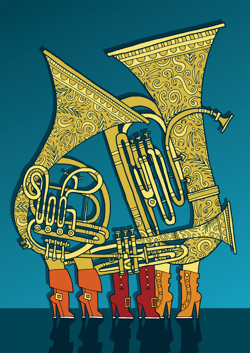A self initiated illustration, imagining how the brass band would be if the instruments were the band and actually played themselves. Variation also used as a proposal for a t-shirt design.